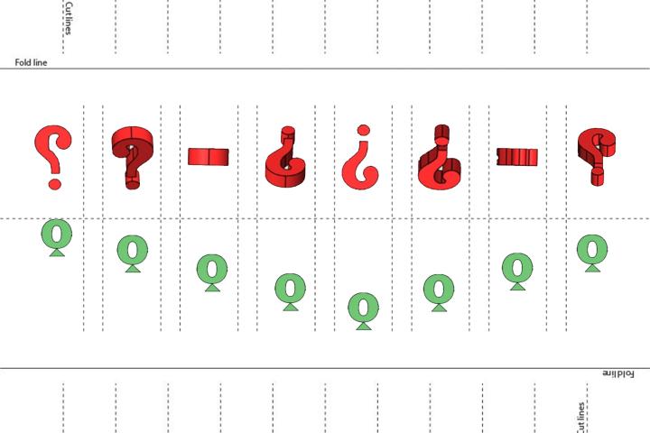 - Cut the paper in half along the middle dotted line so the green Qs are on one sheet and the red question marks are on another.