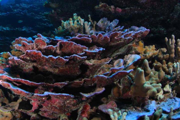 [Image changes to a reef bed with a diagram of the direction of the sun’s rays onto the reef bed]