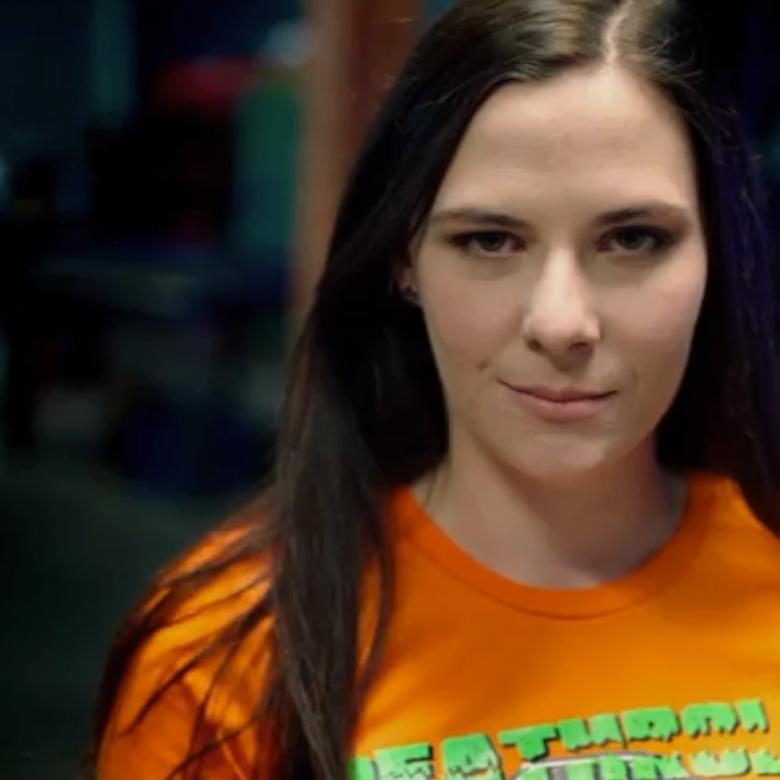 [Shot of Erica in her orange BattleBot team shirt]