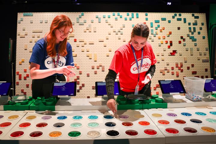 Questacon staff and volunteers wear black, blue, red or teal shirts along with purple lanyards with their name tags. Sometimes they will also wear purple vests over their shirts.